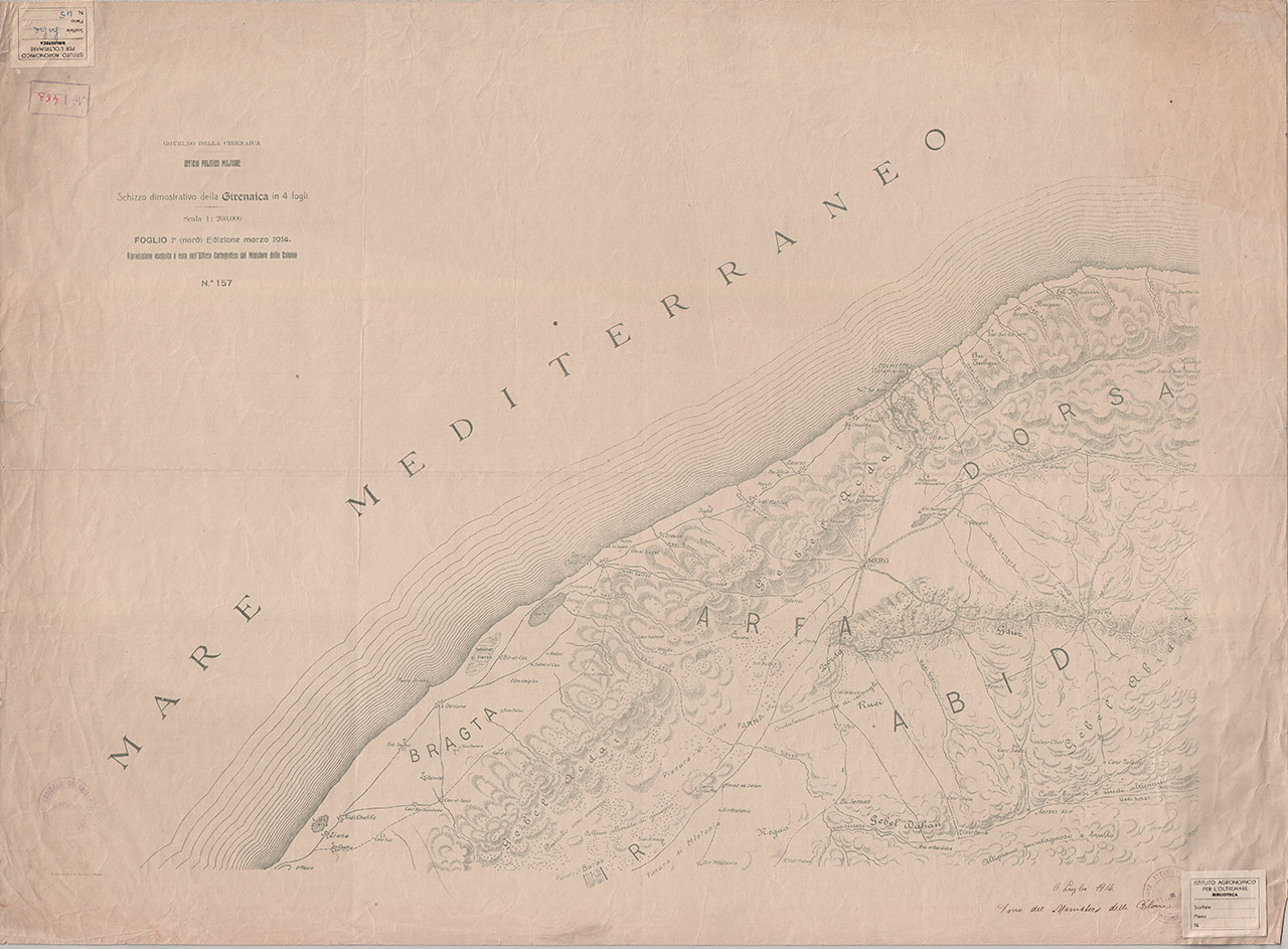 Schizzo dimostrativo della Cirenaica in 4 fogli. Governo della Cirenaica. Ufficio Politico Militare. Foglio 1° (nord). Edizione marzo 1914. Riproduzione eseguita a cura dell'Ufficio Cartografico del Ministero delle Colonie n. 157