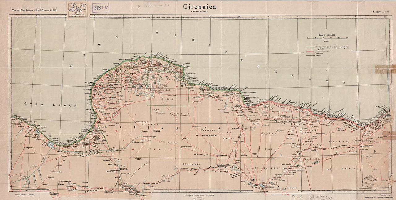 Carta a colori della Cirenaica con legenda e indicazione dei limiti amministrativi, strade camionabili principali, carovaniere e ferrovie. Compilazione e disegno: A. Dardano, capo cartografo.