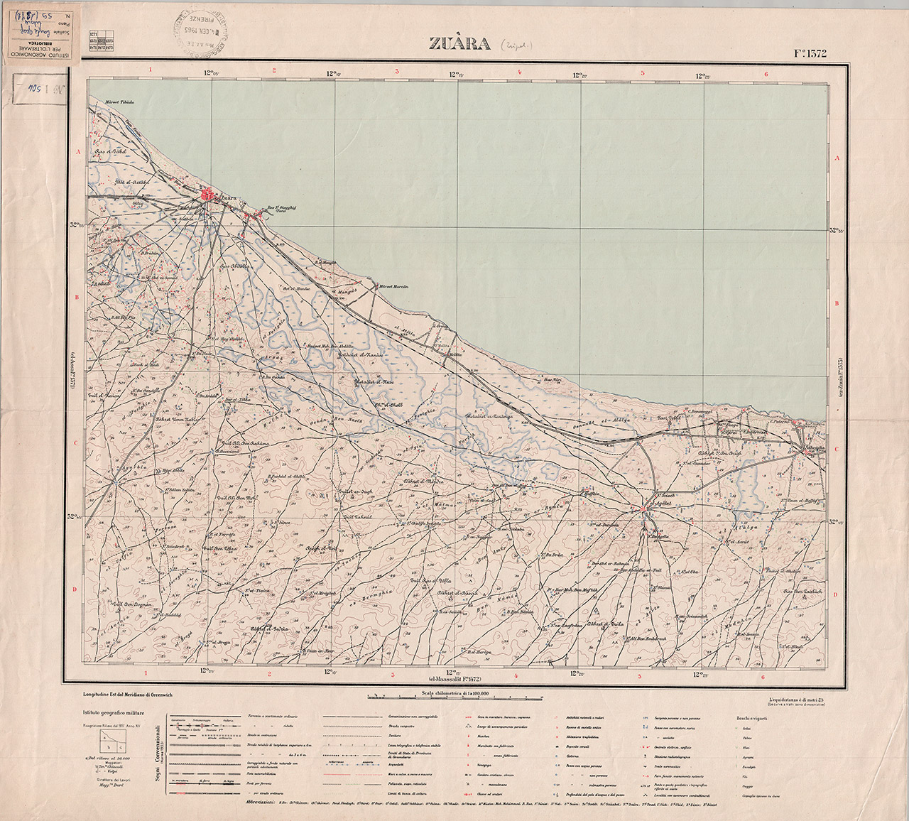 Carta a colori di Zuàra con indicazioni fra cui le strade, le carovaniere e le cisterne. Esso fa parte di una serie di sette fogli. Direttore dei lavori: Magg.re Duri.