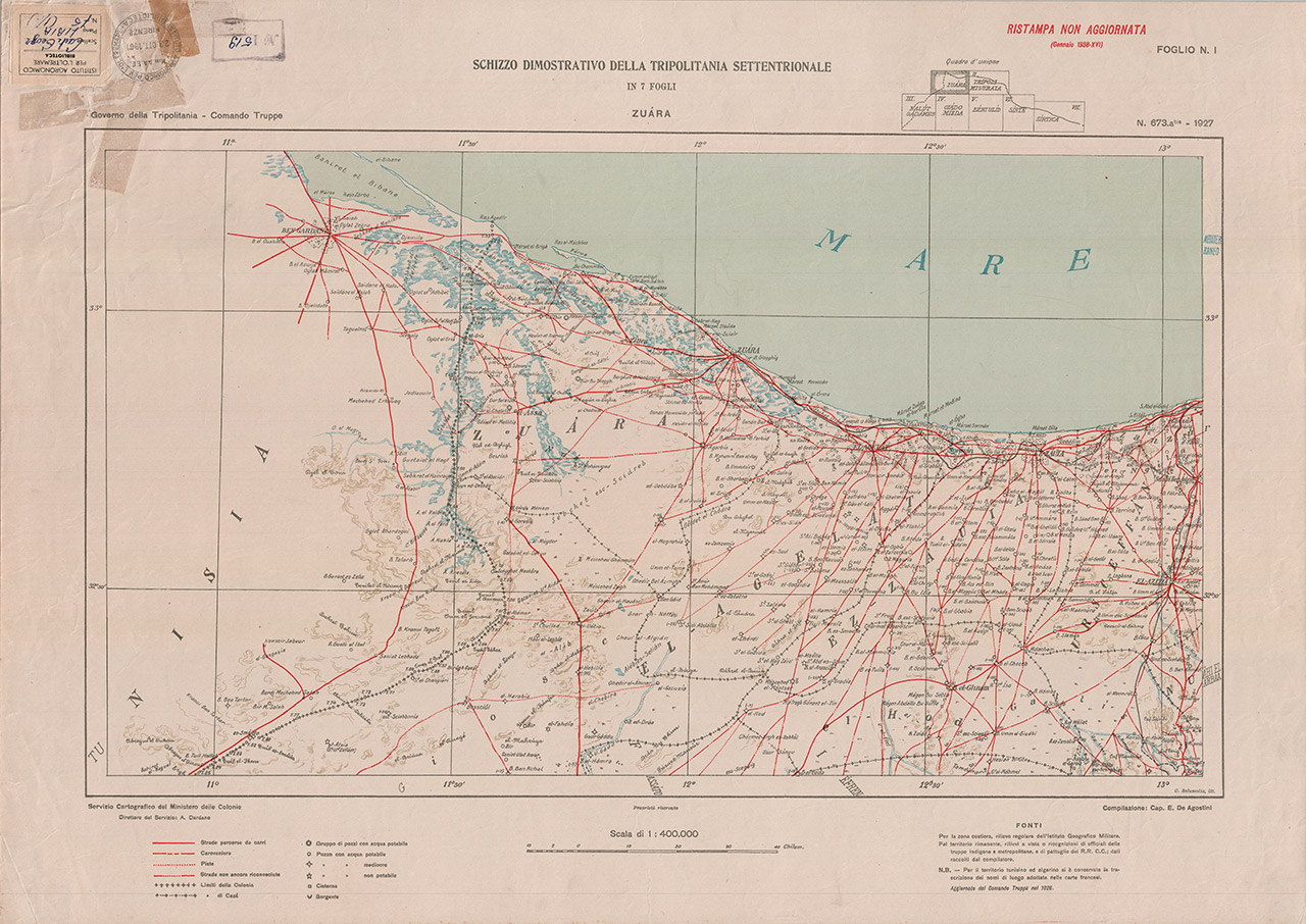 La carta si compone di sette fogli estesi sulla costa alla zona compresa tra i confini della Tunisia e la Sirtica e nell'interno fino al 30° parallelo lat. nord. La carta è stampata a colori con orografia rappresentata dimostrativamente a curve di livello in bistro, idrografia in azzurro, rete stradale in rosso scritture e confini in nero. I fogli sono: 1) Zuara; 2) Tripoli Misurata; 3) Nalùt Gadames; 4) Giado Mizda; 5) Béniulid; 6) Sirte; 7) Sirtica. Fonti: per la zona costiera, rilievo regolare dell'Istituto Geografico Militare; per il territorio rimanente, rilievi a vista o ricognizioni di ufficiali delle truppe indigene e metropolitane e di pattuglia dei R.R. C.C.